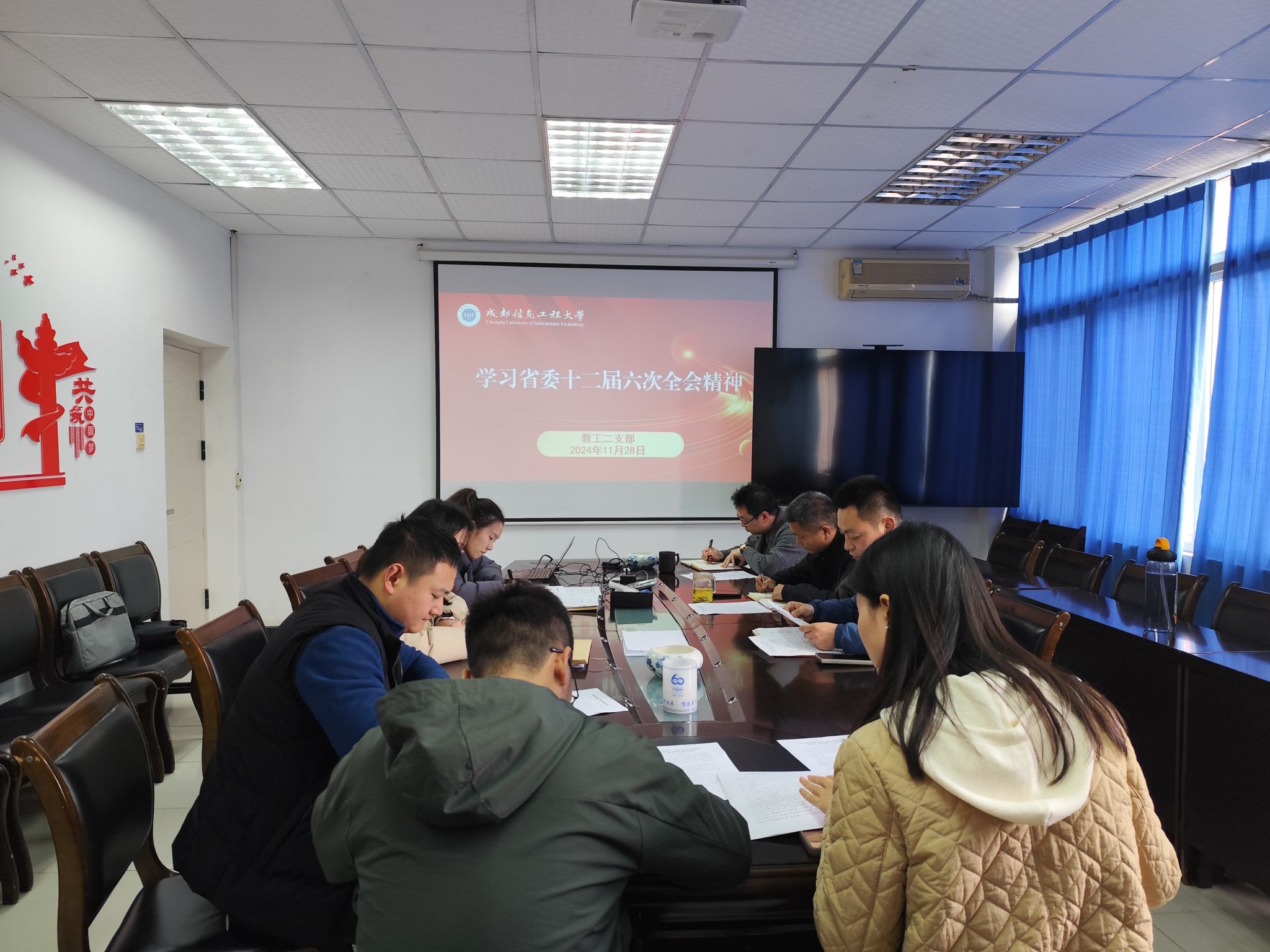 支部书记狄堃带领我们学习了“中共四川省委十二届六次全会公报”“四川高校大调整:新专业调整趋势”,并指出,全体党员要始终保持学习的热情和动力,不断加强自身学习,提高政治素质和业务能力。同时,要紧密结合当前形势和任务,积极探索创新工作方式方法,不断提高工作质量和效率,为推进教育改革和发展贡献更大的力量。