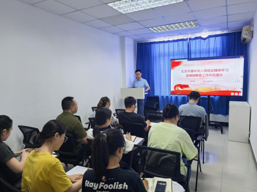 支部书记狄堃随后作《扎实开展中央八项规定精神学习促进继续教育工作作风提升》专题党课。通过剖析违规吃喝、超标接待等典型案例,生动揭示了形式主义、官僚主义、享乐主义和奢靡之风的具体表现及危害。立足继续教育发展实际,狄堃从教学管理、员工沟通、培训服务、生源拓展四个方面提出具体工作要求,并要求全体党员强化思想引领,严格行为规范,建立监督检查和持续改进的闭环工作机制。