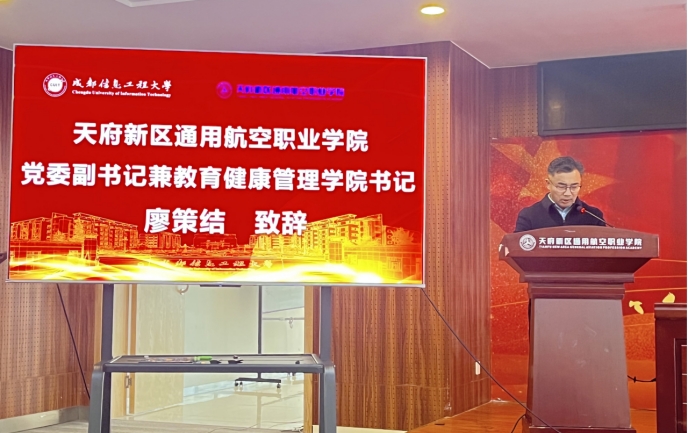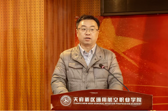 廖策结在致辞中鼓励员工将天府新区通用航空职业学院“尚德、尚技、尚善、尚新”的校训精神与公司的育人理念相结合,明确自考学习路径与目标,努力成为“技能+学历”双优的复合型人才。